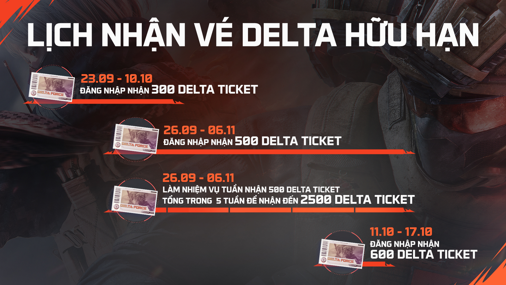 - Khi tham gia chuỗi sự kiện sinh nhật 1 tuổi Delta Force, bạn sẽ nhận được 3900 vé Delta Hữu Hạn miễn phí. Có thể sử dụng để mua vật phẩm và vé quay thưởng trong cửa hàng.